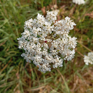 • Ses fleurs sont hermaphrodites à 5 pétales libres, de couleur blanches et à 5 étamines libres. Ses fleurs sont réunies en ombelles plates et entourées d'une grande bractée profondément découpée.